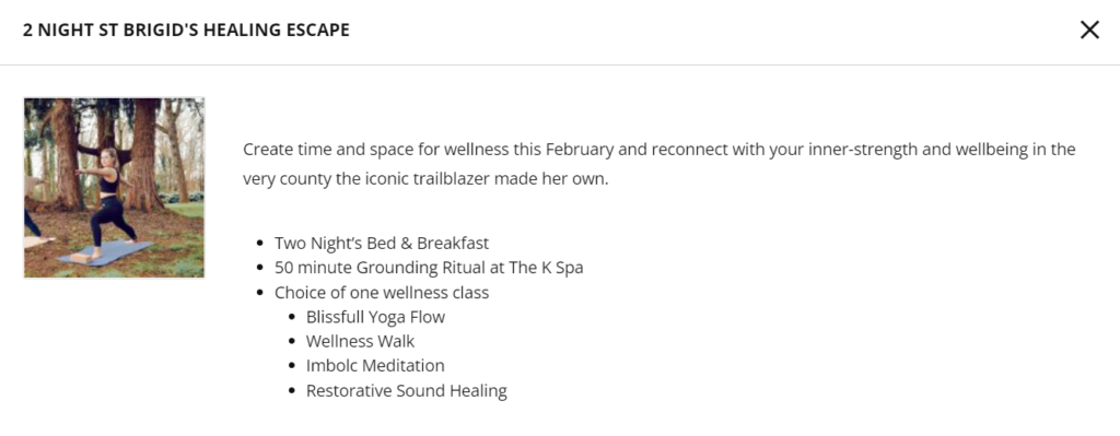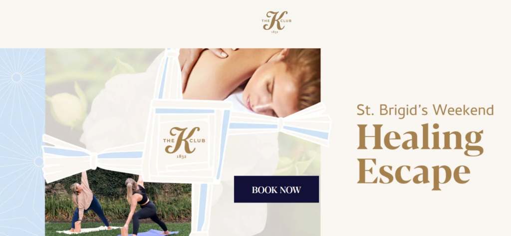 Diversifying your offer and being as creative as possible, while keeping the specific occasion in mind will increase your chances of direct bookings. Your guest will be looking for added value. How can you do that while also being mindful of what St Brigid’s Day represents? Play on the idea of restoration, peace, meditation, relaxation. Think simple, yet smart. A perfect example is this offer from The K Club, ‘The Healing Escape’, which includes a Grounding Ritual, yoga, wellness walks, meditation and more.