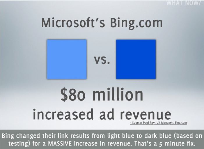 This case study from Bing showed their revenue springing up by $80 million after they changed the colour of a CTA from a lighter blue to a darker blue – the shade they changed to was ‘quite similar to the one used by Google.’