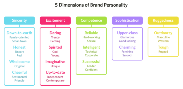 Psychologist and Stanford professor Jennifer Aaker has conducted studies on the topic of using the correct colours that support your brand personality. Her paper titled “Dimensions of Brand Personality” point out five core dimensions that play a role in your brand’s personality. Brands can sometimes overlap between two traits, but usually they are dominated by one.